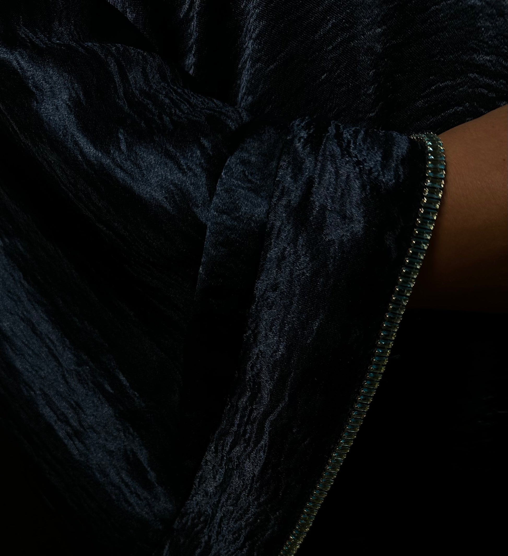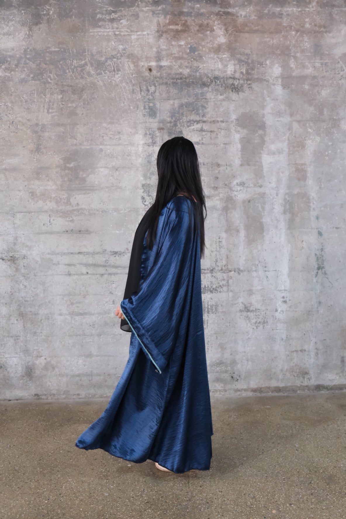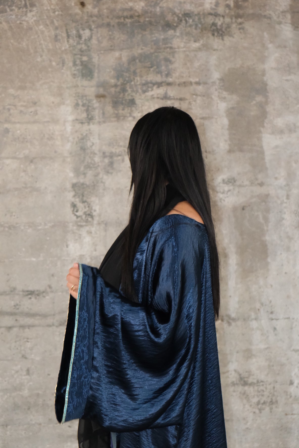 Draped in a deep, luxurious midnight blue, this abaya is crafted from fluid satin that catches the light with a subtle sheen. The relaxed, flowing cut offers effortless elegance, while wide sleeves adorned with topaz detailing add a striking touch of modern artistry. Perfect for evenings, gatherings, or simply when you want to feel refined, this piece blends timeless modesty with elevated sophistication.